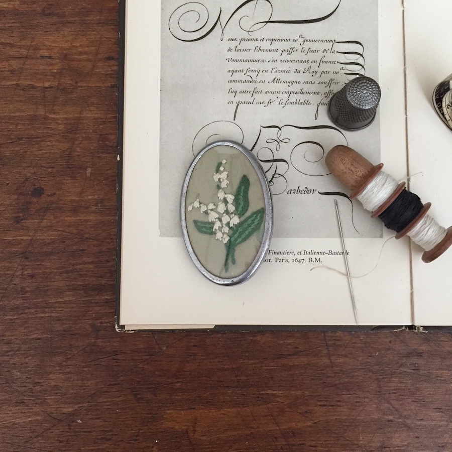 スズランが丁寧に刺繍されたニードルワーク(刺繍)のビンテージブローチ。古くからヨーロッパの人々から愛されてきたスズラン。フランスでは5月1日の「スズランの日」に、友人や家族など愛する人にすずらんを贈る習慣がり、贈られた人には幸せが訪れるといわれています。そんなスズランがモチーフとなったセンスが感じられる丁寧な手仕事でお洋服やバックに彩りを添えてくれます。