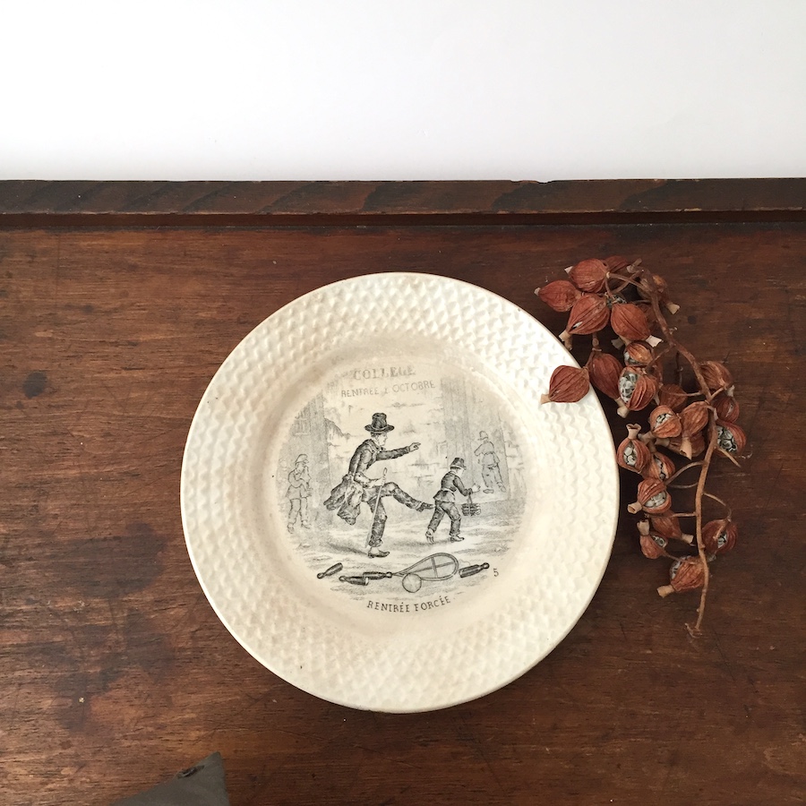 19世紀後半から20世紀初頭にかけて製造されたフランス陶器メーカーのアンティークプレート。新学期を前に子供を学校へ送り出す様子が描かれた、微笑ましい情景が描かれています。